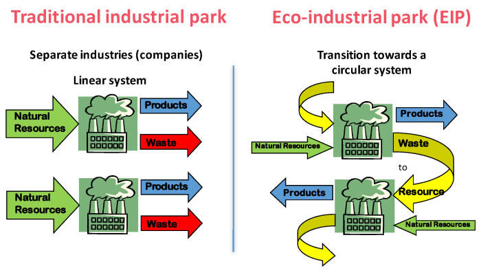 Di dalam Eco Industrial Park, perusahaan-perusahaan bekerja sama untuk saling memanfaatkan sumber daya, meminimalkan limbah, dan mengurangi dampak lingkungan. Konsep ini mendorong kolaborasi antara perusahaan, pemerintah, dan masyarakat untuk menciptakan sistem industri yang lebih berkelanjutan.